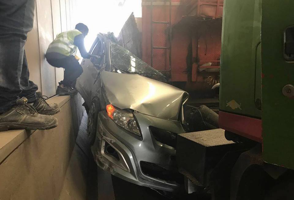 News, Transportation, Viral Trailer trashed: Man manages to escape with minor injury after his car gets pancaked by truck in Tuas Coconuts Singapore | April 20, 2017