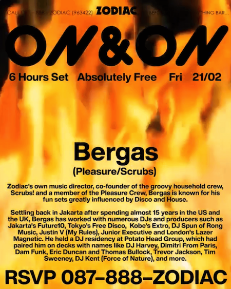 Get loose this Friday to the 6-hour set by ZODIAC’s music director, Bergas, known for his Disco and House-fueled fun selections to get everyone warmed up and jumpin’ on the dancefloor.