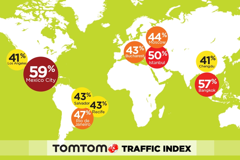 Bangkok was pipped to the top spot by the Mexican capital, where drivers spend 59 per cent extra travel time in traffic. Next was Istanbul (50 per cent), followed by Rio de Janeiro (47 per cent) and Moscow (44 per cent).