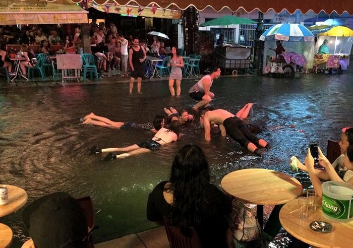 Remember the flood we suffered through in June? Tourist destination such as Khaosan Road were no exception. This caused one group of hopefully intoxicated Western backpackers, who have probably never lived through a proper flood before, to excitedly swim in the disgusting waste water as Thai people laughed and took their photos.