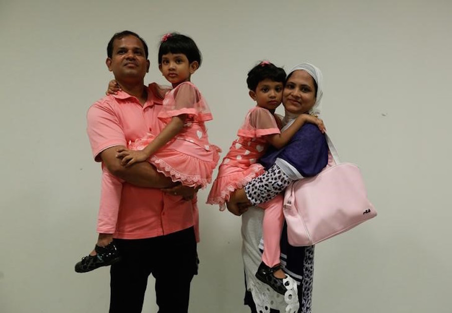 Kazi Mohammad, 40, and wife Arifa Afroz, 37, pose with their daughters Sanzida (2nd L), 6, and Shahzia, 5, in Hong Kong on June 16, 2016, after they fled Bangladesh. Photo: Reuters/Bobby Yip
