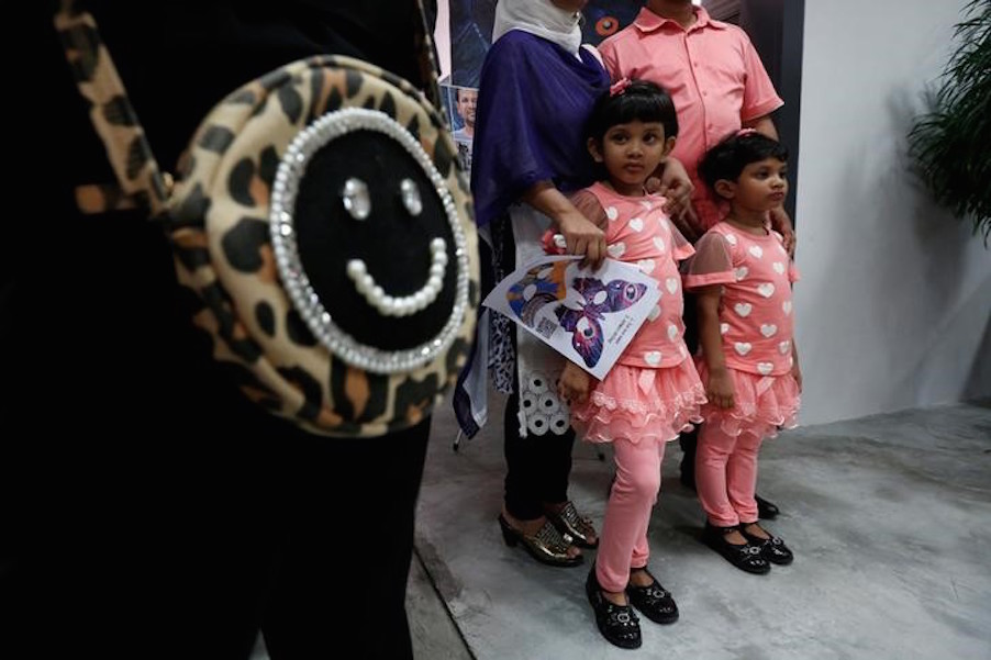 Sanzida (L), 6, looks on beside her younger sister Shahzia, 5, as they and their parents attend an awareness arts show on refugees in Hong Kong on June 16, 2016. Photo: Reuters/Bobby Yip