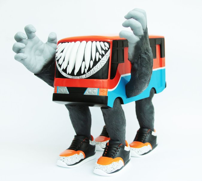 It’s especially evident in “The King of Jakarta” (pictured above). Shown at last May’s Hong Kong Art Basel, the resin sculpture depicts the infamous, menacingly driven MetroMini public bus as the ruler of the road, with arms like a gorialla and, in place of wheels, furry legs wearing Nike sneakers. To complete the sculpture, the squid monster makes an appearance on the windshield.
