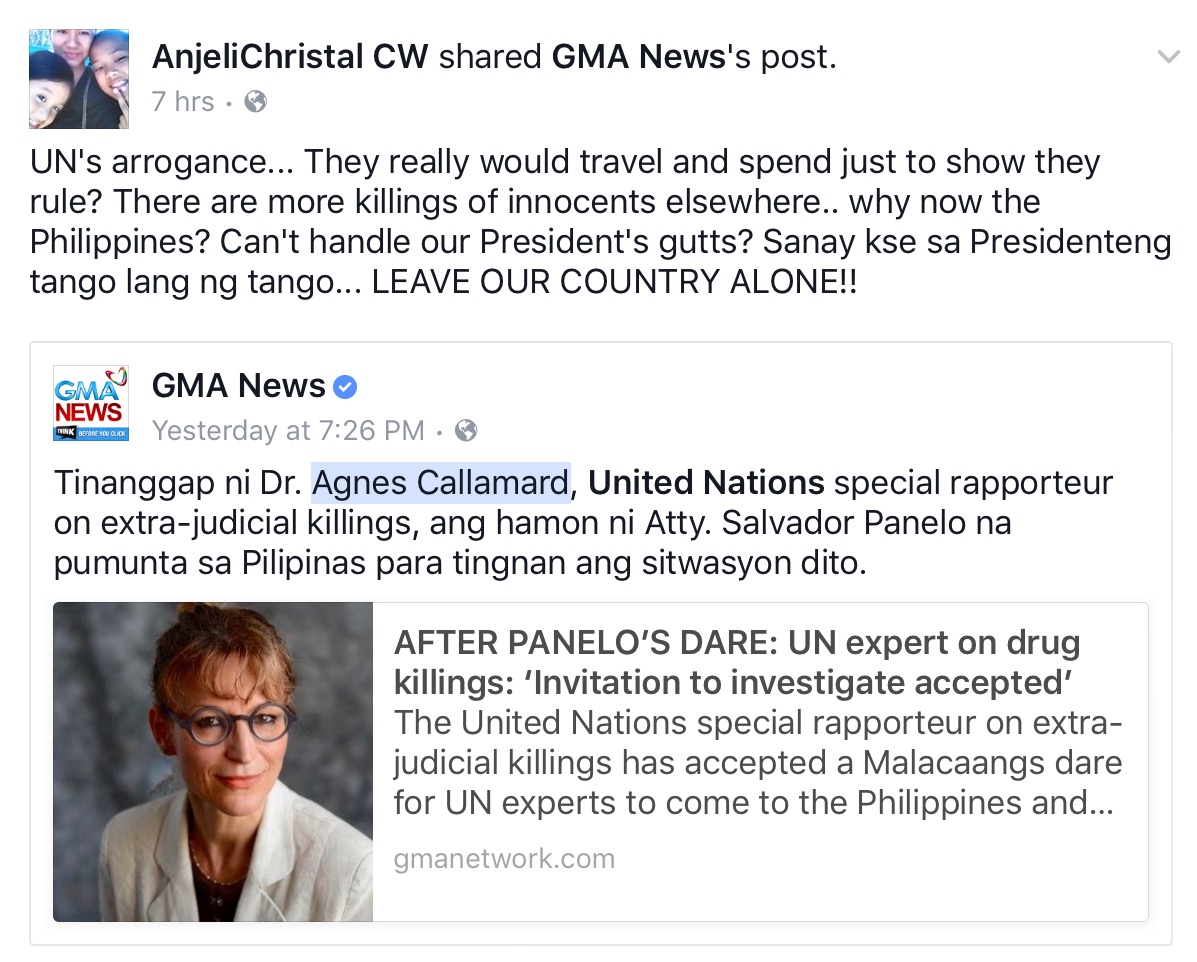 United Nations special rapporteur (reporter) on summary executions Agnes Callamard has happily accepted the challenge to come to the Philippines so she could see for herself the situation behind President Rodrigo Duterte’s controversial and bloody war on drugs.