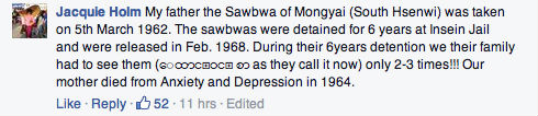 “President Mahn Win Maung, Prime Minister U Nu, all members of the cabinet and many other senior political figures including leading Shan sawbwas were arrested over the day. Sao Myee Myee, the 17 year old son of the first President Sao Shwe Thaike was killed before dawn during the takeover of his father’s home on Kokine Road,” he wrote, describing what happened in the early hours of the morning when it all began.