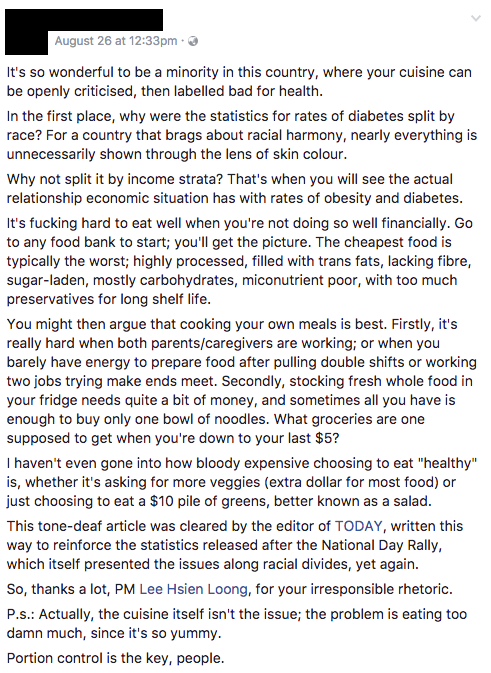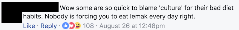 You can read the whole article here, but in case of TL;DR, the two writers (of Chinese descent) argued strongly that Malays and Indians in Singapore have to change their eating habits if they want to win a “war against diabetes”. Traditional methods of cooking their dishes are unhealthy, the journalists asserted, and it would be hard to change the mindsets of either communities.