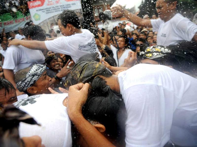 Every year, men and women approximately ages 17-30 line up in Banjar Kaja Sesatan Village, Denpasar for omed-omedan and kiss en masse to celebrate the passing of the Balinese new year on the day after being cooped up inside all day for Nyepi. Before taking to the streets, the ritual beings with worship in the temple.