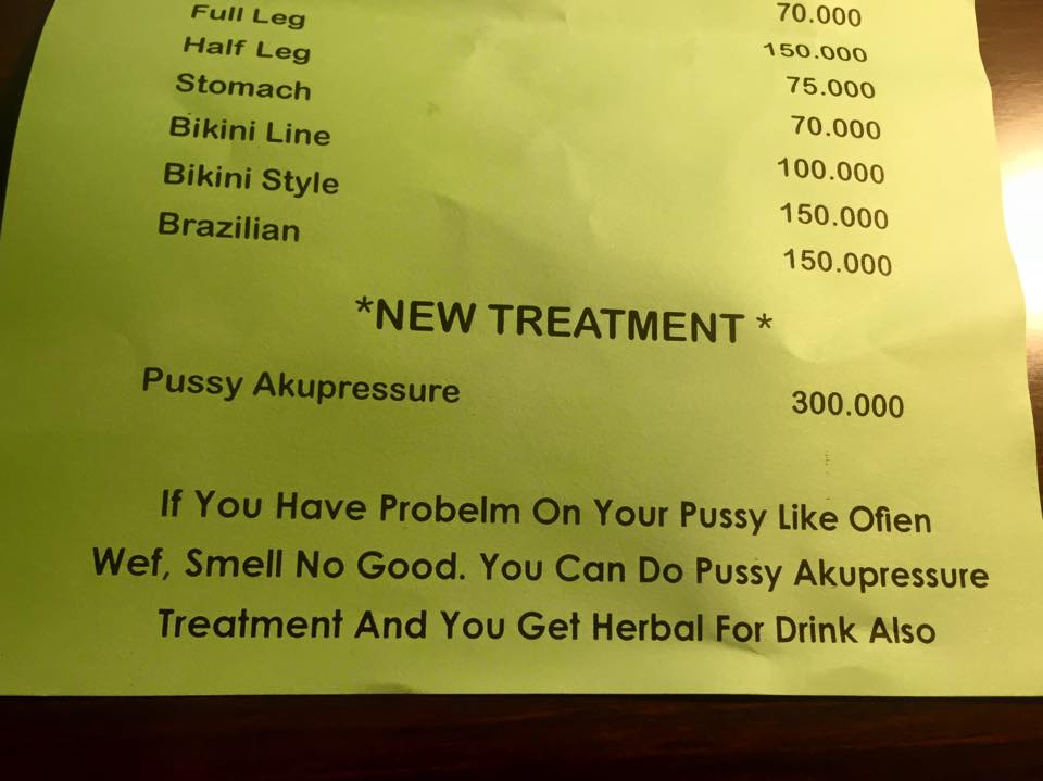 “If you have problem on your pussy like often wet, smell no good.. you can do pussy akupressure treatment and you get herbal for drink also,” the pamphlet read so boldly.