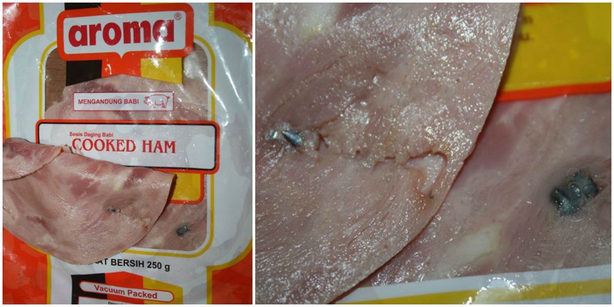 A man posted on Facebook pictures of his packaged pork which he seems to have bought in Bali and there appears to be something shiny that does not belong in your average pig meat.