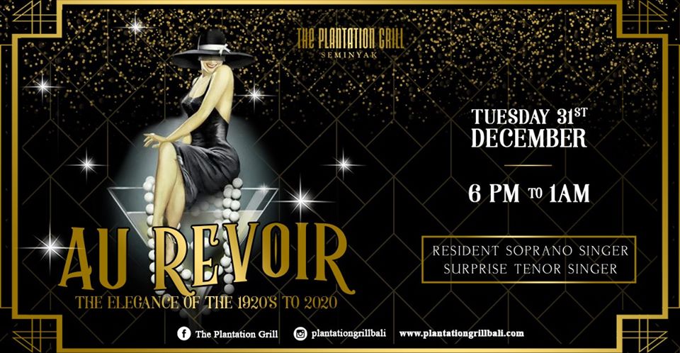 Tuesday, Dec 31 from 6pm to 1am. Reservations, including a security deposit, are required via email reservations@plantationgrillbali.com or WhatsApp +6281999895111.