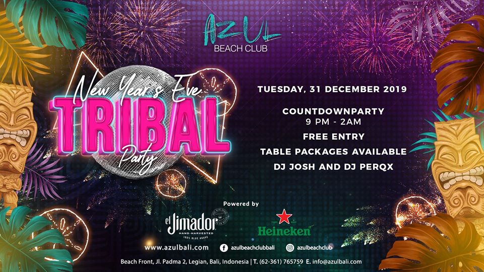 Tuesday, Dec 31 at 9pm to 2am. Free entry. Reserve table packages via info@azulbali.com or call +62361 765759.