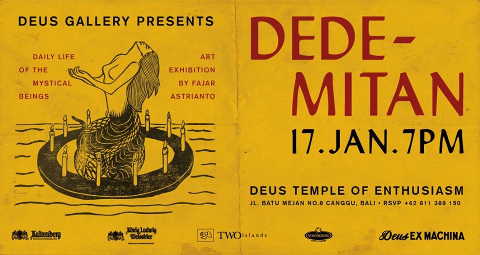 Fajar Astrianto’s work explores the tales of mystical beings and asks the question: why are they here? In these visualizations, Fajar attempts to dig deeper into the idea that so contrasts Western beliefs and provide an understanding as to why spirits, ghosts, wewe, jerangkong are said to exist side by side with human beings. Check out Fajar’s interpretations at the Deus Gallery, where there will also be free flow wine, beer and cider.