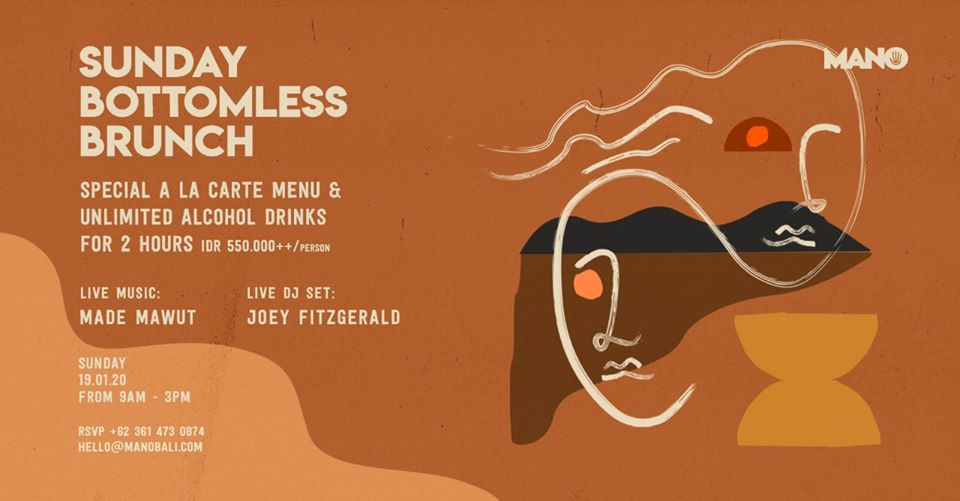 Sunday, Jan 19 at Mano Beach House from 9am to 3pm. Sunday Bottomless Brunch is IDR550k++ per person, book your spot through their website or hello@manobali.com.