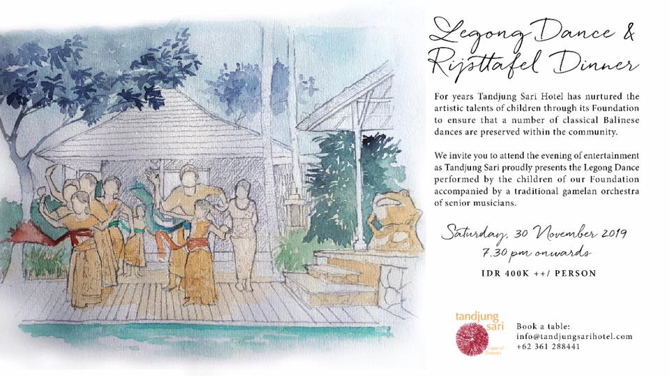 Rijstaffel refers to an elaborate Indonesian meal adapted by the Dutch, which follows the presentation of Padangnese cuisine from West Sumatra. If you fancy yourself a dinner of this style, Tandjung Sari Hotel in Sanur is hosting a special event this Saturday, where guests will also get to watch a performance of the Legong Dance, accompanied by a traditional gamelan orchestra.