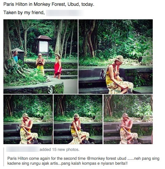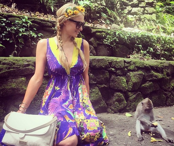 Paris Hilton was spotted in Ubud yesterday playing with monkeys and today looking like a new wave Ubud hippie (or whatever they’re called).