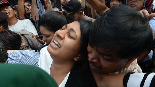 Brintha Sukumaran (L), the sister of Australian drug convict and death row prisoner Myuran Sukumaran, breaks down after arriving at Nusakambangan port in Cilalcap on April 28, 2015. PHOTO: AFP