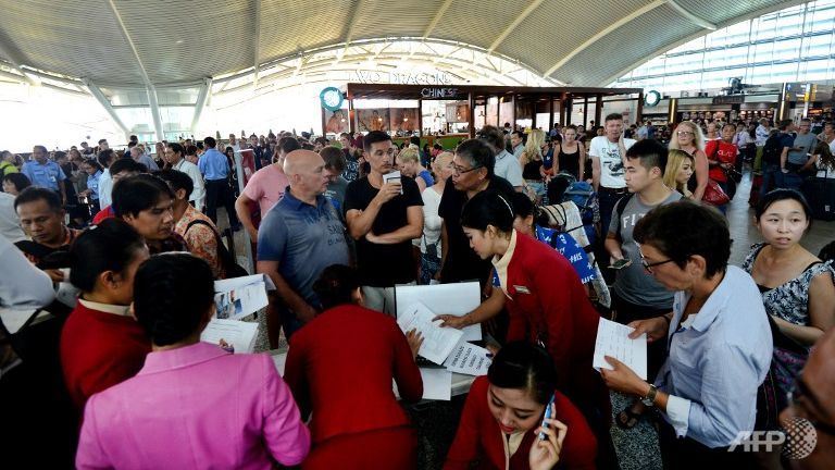 Passengers queue to get information about delayed flights at the international departure area of Bali’s Ngurah Rai Airport. PHOTO: Sonny Tumbelaka/AFP