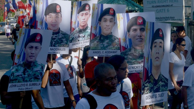 Family and supporters hold some of the pictures of the 44 police commandos killed as they hunted the Malaysian Zulkifli bin Hir, also known as Marwan blamed for the 2002 Bali bombings in Indonesia, in which 202 people died, during a “Sympathy Walk” in Manila. Photo: AFP