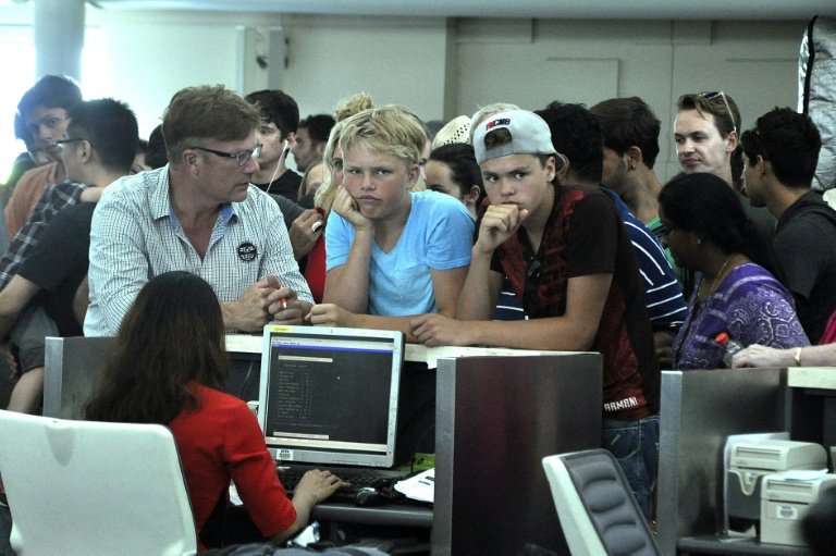 International travelers crowd the check-in counters at Ngurah Rai International airport in Denpasar, on Indonesia’s resort island of Bali, on July 11, 2015. PHOTO: Riyanto/AFP