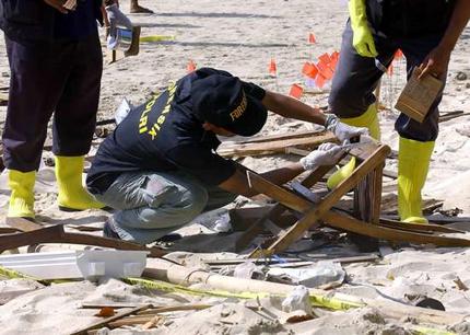 Indonesian forensic experts search for clues at the bomb blast scene in Jimbaran, 2005. PHOTO: AFP