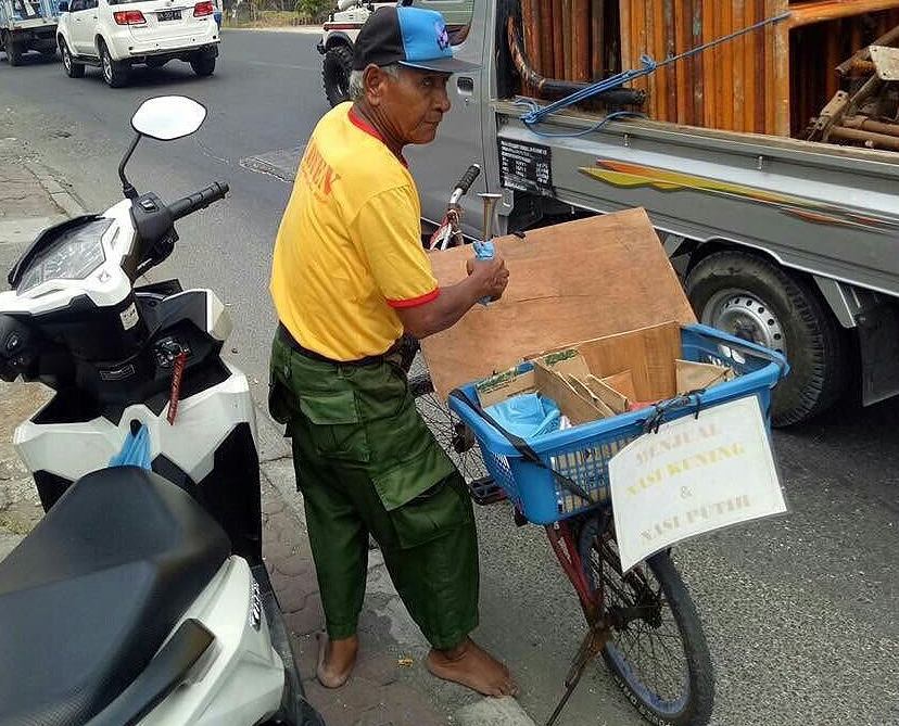 A picture shared by citizen journalist site Info Denpasar shows the barefoot bapak selling the nasi on the side of a busy road.
