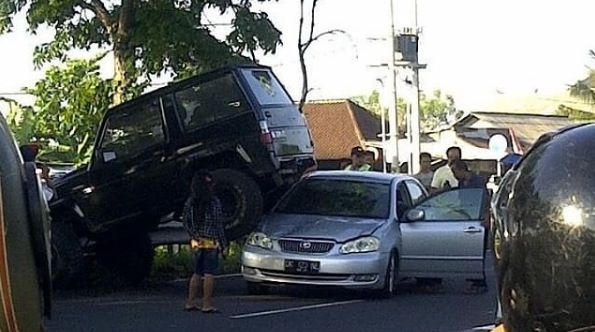 A photo posted by Bali citizen journalist site, Info Denpasar, shows a couple of cars stacked up high on the side of the road.