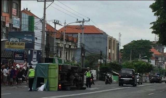 A truck, allegedly with a drunk driver behind the wheel, rolled over on West Jl. Gatot Subroto (Gatsu) in Denpasar on Sunday afternoon.