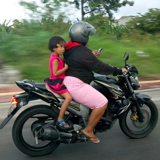 A photo, apparently taken in Denpasar, shows a woman texting and driving a Byson motorcycle with a kid riding on back—and the kid doesn’t have a helmet on.