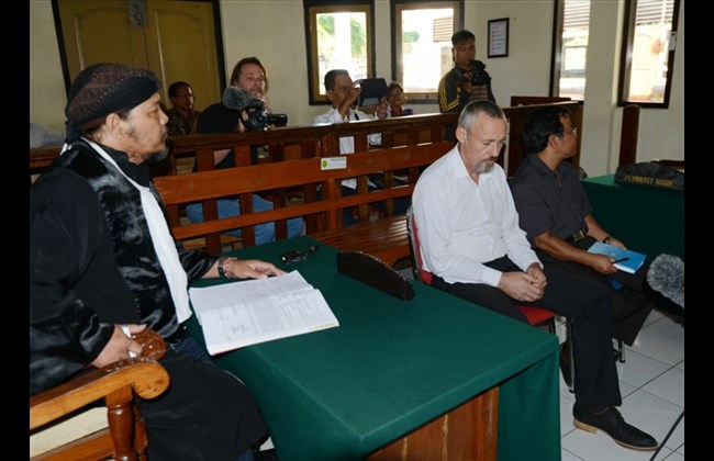 Antony de Malmanche of New Zealand (2nd R), who was detained last December with 1.7 kilograms (3.7 pounds) of crystal methamphetamine hidden inside his backpack, listens to the judges during his trial at a court in Denpasar, on Indonesia’s resort island of Bali on June 25, 2015. PHOTO: SONNY TUMBELAKA/AFP