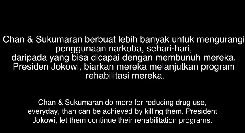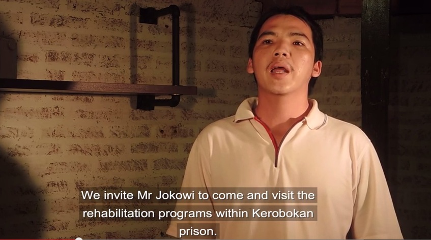 Ultimately, the video urges the tough-on-drugs Indonesian president to come visit Kerobokan Prison and see firsthand the rehabilitation work that Chan and Sukumaran have pioneered in the prison.