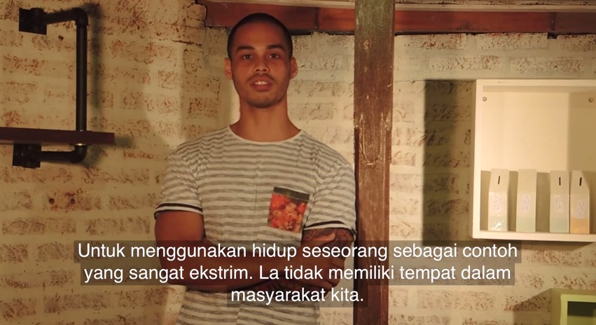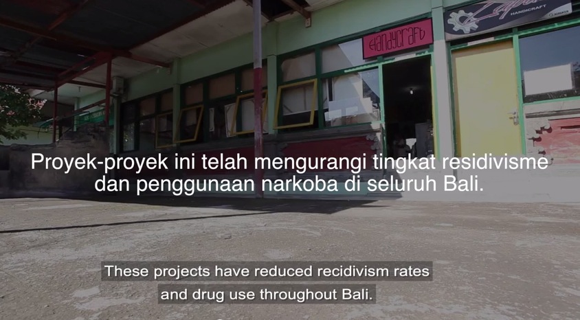 The bilingual English-Bahasa Indonesia video then shows scenes from Kerobokan Prison of Myuran Sukumaran’s work in the art program and Andrew Chan leading a prayer amoung inmates.