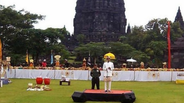 Today in Yogyakarta, Jokowi apparently wore traditional Balinese dress, complete with udeng and along with the First Lady, addressed the Hindu Balinese new year of 1937 at one of Indonesia’s most famous Hindu temples, Prambanan, according to Berita Satu.
