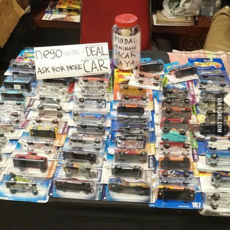 A photo was recently uploaded on 9GAG of a prized collection of Hot Wheels and other toy cars, all lined up with a piece of paper that reads “Nego sampai deal, ask for more car,” along with a money jar bearing the words, “Modal peminang pacar saya.” In other words: negotiable until a deal is reached, ask for more cars and funds for my fiancée.