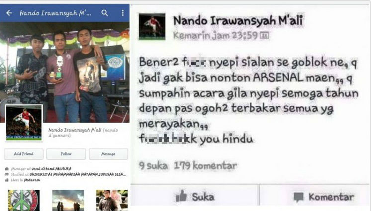 Nyepi, the Balinese day of silence means no loud sounds, no bright lights, and entertainment like cable is switched off. A person operating under the Facebook profile of Nando Irawansyah M’ali was straight up outraged when the local holiday kept him from his match, so he posted a very offensive status on Facebook with some intense expletives.