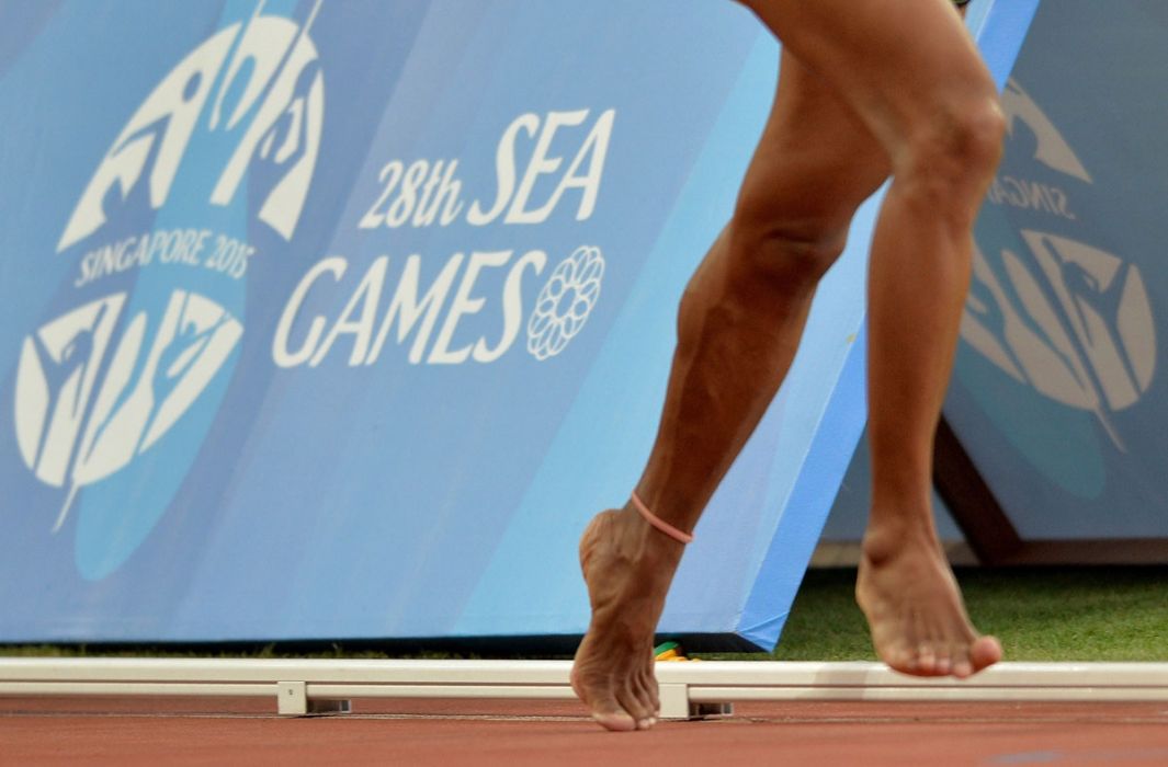 Pa Pa of Myanmar runs barefoot in the women’s 5000m final athletics event during the 28th Southeast Asian Games (SEA Games) in Singapore on June 9, 2015. PHOTO: MANAN VATSYAYANA/AFP/Getty Images