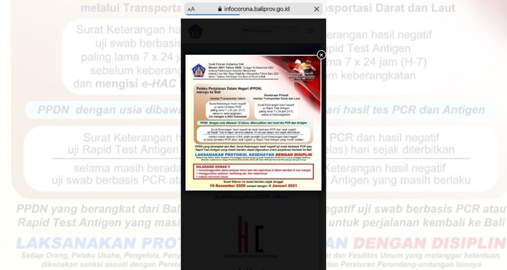 The circular set the Christmas and New Year break period to begin on Dec. 19 and last until Jan. 8, when officials in Bali previously said that the requirements are applicable until Jan. 4. In fact, the same announcement is still up on the Bali provincial government website at the time of publication, as you can see in the screengrab below: