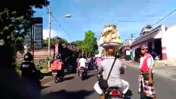 The latest balancing achievement in Bali appears to have been captured in a viral video of a man driving his motorbike carrying a basket stacked high with offerings on his head.