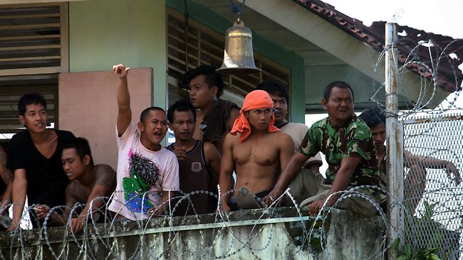 Prisoners look from a tower during the riot at Kerobokan prison in Bali. Photo: AFP (2012)
