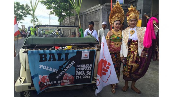 Instead of the usual flowers, a protest banner for the Tolak Reklamasi campaign adorned the transport for bride and groom Ni Wayan Ketut Setiari and Ketut Kertayasa on Thursday.