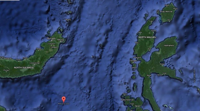 The quake struck at a depth of 52 kilometers under the Molucca Sea at about 3:40 pm, between the islands of Sulawesi and Halmahera