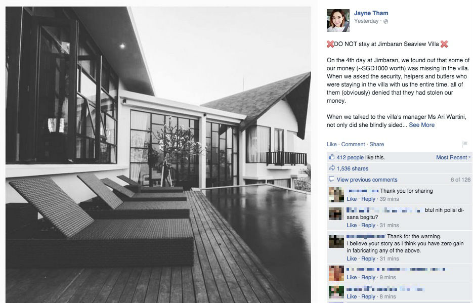Doing what they do best, the bloggers took their beef with the villa to Facebook, naming and shaming “Jimbaran Sea View Villa,” and instructing their followers not to stay there.