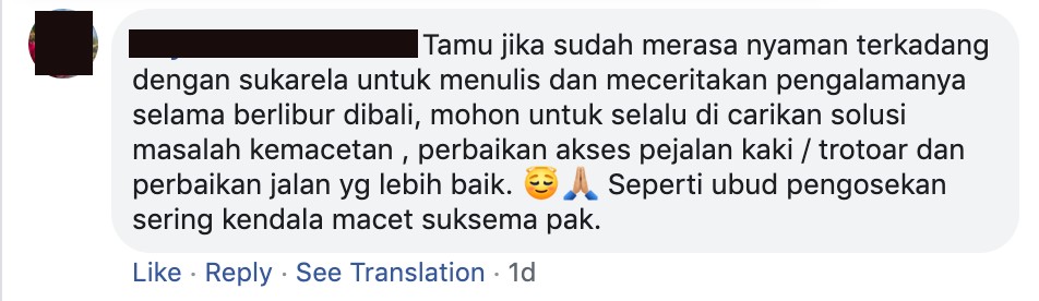 Guests who are comfortable will voluntarily write or tell their stories of visiting Bali, please always find a solution to the problem of congestion, fix pedestrian access and sidewalks, and overall better road repair. Such as Pengosekan [in Ubud] there are often traffic congestion, thank you sir.