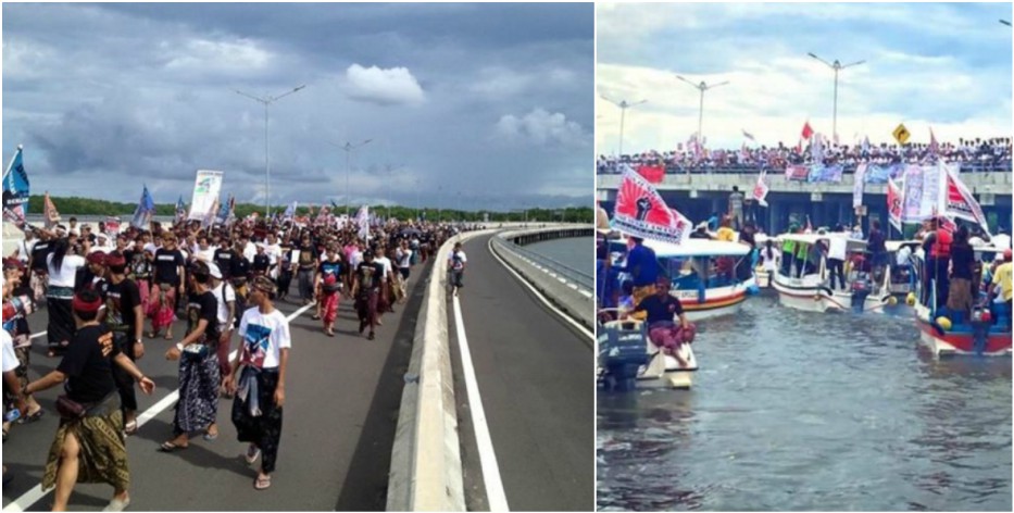 For about 15 minutes on Sunday afternoon, the Bali Mandara Toll Road was totally unaccessible as hordes of people set up a demo and marched on the road, rejecting the controversial project that would reclaim 700 hectares of south Bali’s Benoa Bay.
