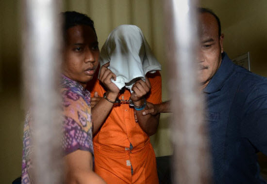 Police escort Tommy Schaefer (C) while in custody at a holding cell at Bali police hospital in Denpasar on the Indonesian resort island of Bali, Aug 15, 2014. PHOTO: AFP