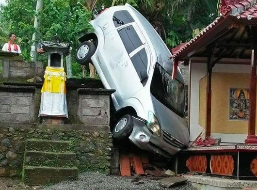 A ‘WTF’ photo going viral on Bali social media shows a car plunging into the side of some poor family’s house.