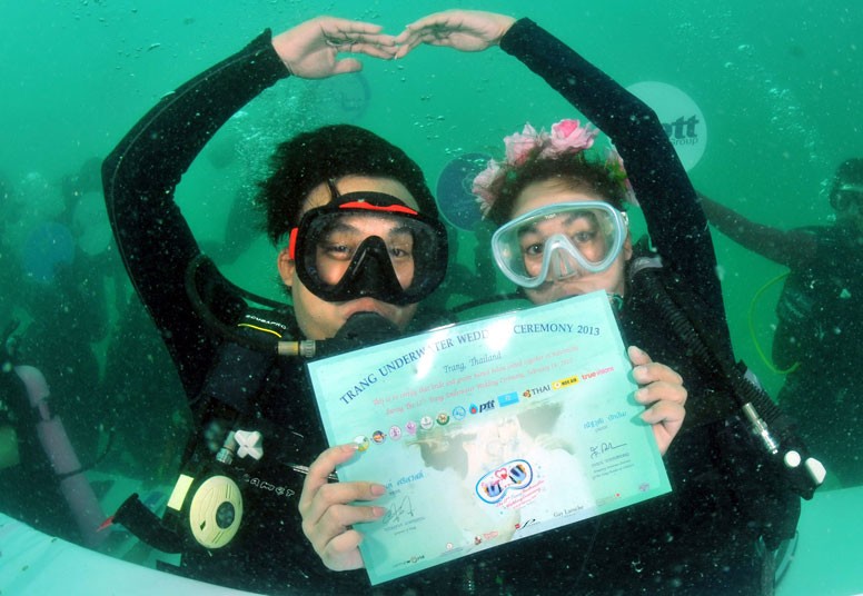 Couples will dirve off the coast of Trang for three days of ceremonies which culminate in registering their marriage underwater. The watery rites will be preceeded by traditional a Thai wedding ceremony conducted on dry land.