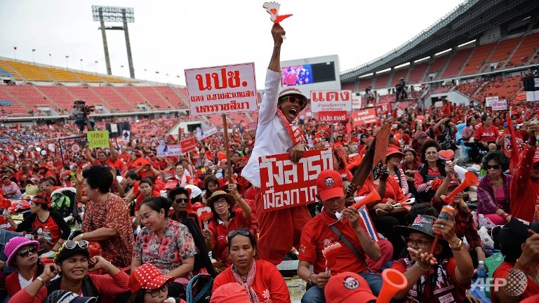 Red Shirt supporters shout slogans during a rally at a stadium in Bangkok. Photo: Christophe Archambault / AFP