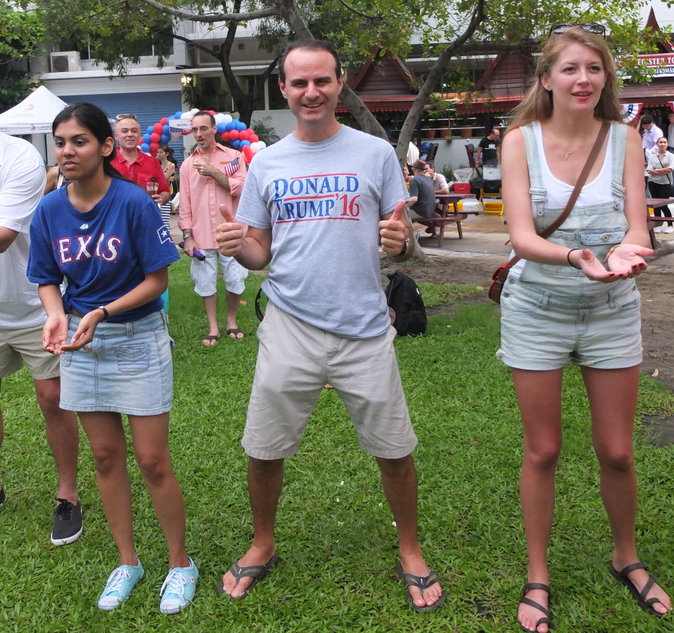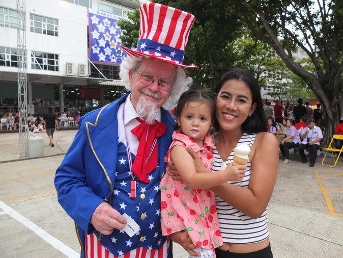 Paul Robere was dressed up as Uncle Sam. The 28-year member of AMCHAM explained that the event is more than just a day of fun for homesick Americans. The entry fee and raffle tickets raise money for the AMCHAM Thailand Charitable Foundation’s initiatives to improve education in Thailand. He said, “it raises money for foundations, school scholarships, and all kinds of programs to help kids.”