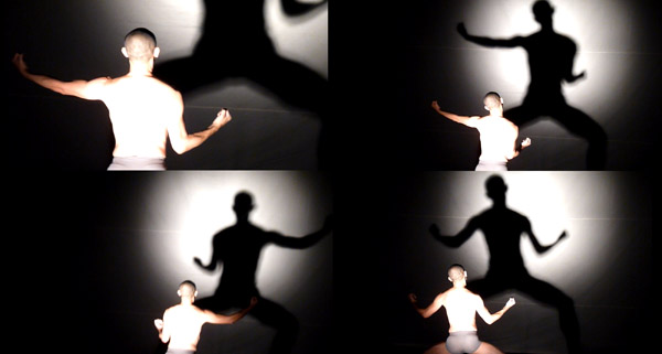 Stomping, stalking and sweating across a spartan stage, the demon erupts from a man’s form. An outsized shadow menaces from the back wall, and it’s unclear which is mimicry. Coaxing along this transformation is the dancer’s mentor, himself a demon, whose disembodied voice intones cues from the afterlife.