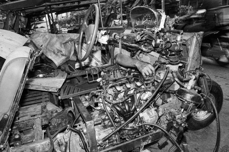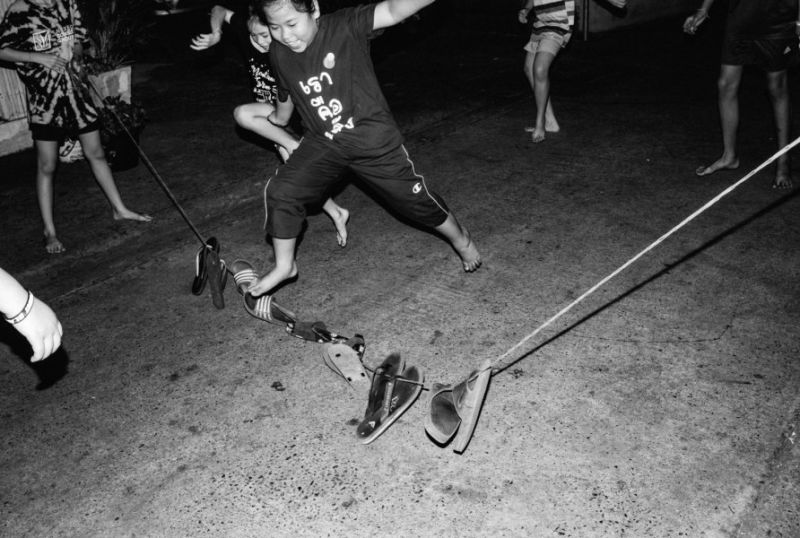 Shot mostly on film, his images reveal a Thonburi overshadowed by breakneck development: a man stretching in a park with a cigarette in hand, kids skipping over a makeshift jump rope fashioned out of shoes, a fake ivy wall outside a flattened stretch of land set to become a condo. They’re often funny and absurd.